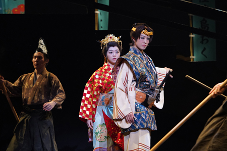 黒地に金色の雲型がたなびいている舞台美術を背景に、中央には大きな太鼓橋のセット。物語は慶長5年の京都・四条河原で、その太鼓橋の頂上に立つ阿国(北翔)を、地面からお丹(峯岸)が見上げている場面から始まる。次いで民衆が舞台を埋め尽くすと、「浮世で傷ついた心と体を、この阿国が慰めてさしあげましょう!」と再び阿国が登場。華やかな笑顔と豊かな歌声で、一気に客席を惹きつける。北翔は、興行を実現するため勧進元には“色”も使うが、さっぱりときっぷのいい阿国を表現。大津城で戦いに巻き込まれた際には、一座の女衆やお丹を守りながら避難させるなど、孤高のカリスマというより、人間らしさを感じさせる阿国像を演じている。