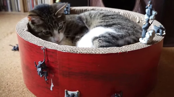 段ボール製猫ベッドで寝込みを襲われ、ミニ忍者に包囲されたサバトラ猫のおはぎ。状況はよくわかってないなりに、なんとなく不満気。そりゃそうですよね。しかし偶然に耳アタックで1人目の忍者を始末したのを皮切りに、恐るべし猫の実力を発揮するのであります。ほのぼのと。