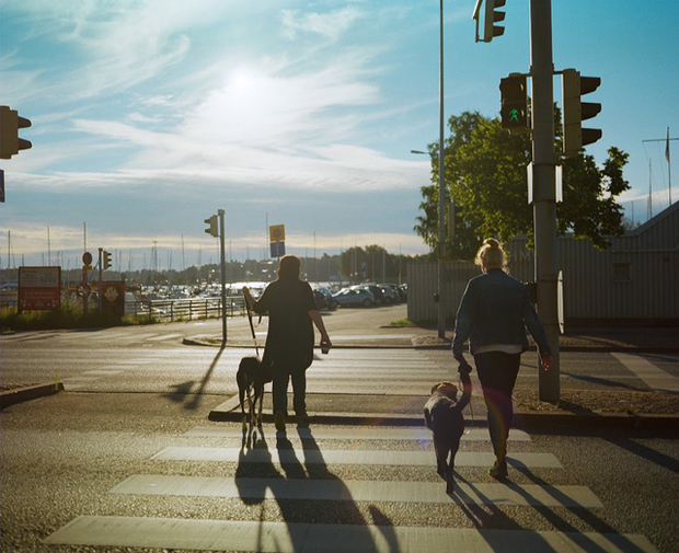 「CAMERA:makina67 / 朝7時。犬の散歩をしている二人を追いかけながら。逆光だし、歩いてるしピントを合わせるのが難しかった!!!」