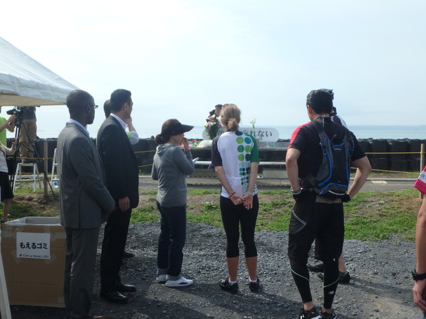 尚、大谷海岸に設けられたエイドステーションには、献花台が設けられていました。ここではケネディ駐日米国大使も献花されていましたが、その後、しばらく献花台を見つめながら思いを馳せているようでした。