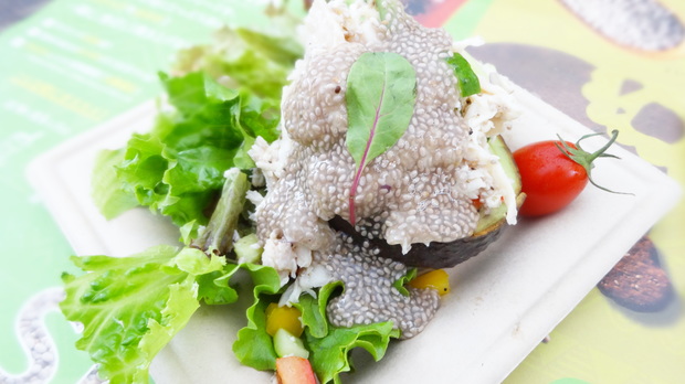 どっさりかけられたチアシードに隠れて見えづらいですが、アボカドを器にして、鶏ささみやきゅうり、パプリカなどが盛りつけられているサラダ。