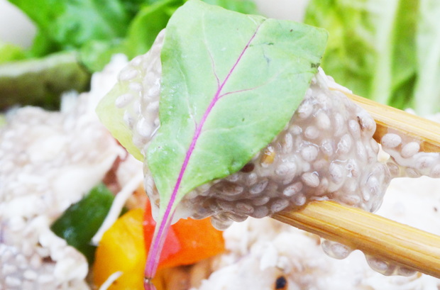 今回のメニューで使用されているチアシードはすべてが白いホワイトチアシード。黒もカエルの卵のようだとは思いますが、白いつぶつぶもなかなか視覚的な破壊力がありますね……。