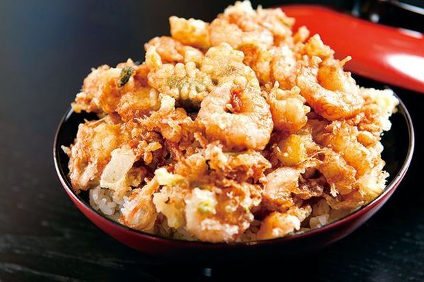 海老、イカ、野菜入りのかき揚げは丼を覆うほどに大きい。タレが甘辛く、ご飯がすすむ。