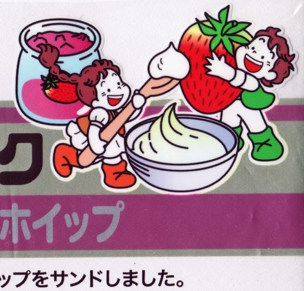 ちょっと変わってる2010年の「あまおう苺入りクリーム&ホイップ」は苺大福的な組み合わせを味わえるランチパック。苺を抱く女の子を包むもちを抱く男の子、という4重コーティングイラストが、ランチパックの持つ「包む」という根源的なテーマを荘厳に繰り返し想起させる、と思う人は考えすぎだと思います。