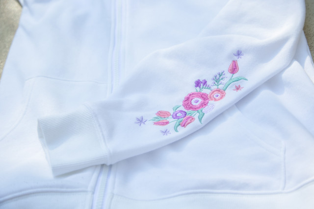袖には花の刺繍があしらわれています。
