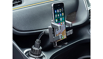 CAR-HLD4BKNは、ダッシュボードに取り付けるタイプと異なり、前方への視線を遮らないのが特徴。ドリンクホルダーにはめ込むだけで固定でき、面倒な工具を使用する必要がなく、簡単に取り付けることができる。取り付け部分の直径サイズを調整でき、ドリンクホルダーにピッタリとフィットする。