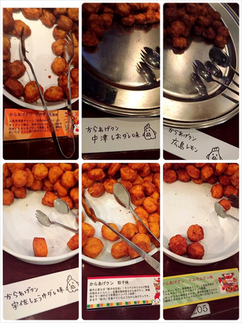 ゆずポン酢、宇佐しょうゆダレ、中津しおダレ、博多めんたいマヨネーズ、深谷ねぎ、幻の手羽先風味、オマール海老のロースト風味、クワトロフロマッジ、渡り蟹のトマトクリームソース、でからあげクン4種のペッパー、餃子、ハワイアンバーベキュー、トムヤムクン、焙煎ごまマヨネーズ。