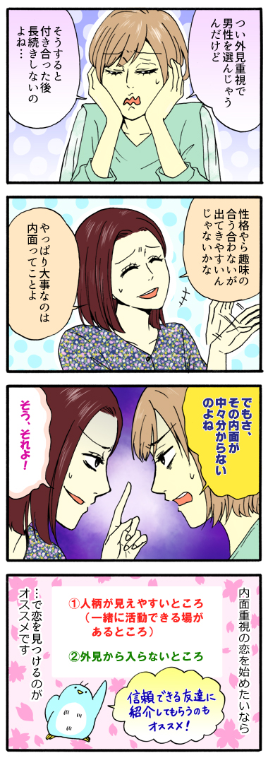人柄重視の恋愛をしたいなら、色々な活動をしたり、友達との信頼関係を築いて紹介してもらうといった広がりを作ることが大切なのですね。