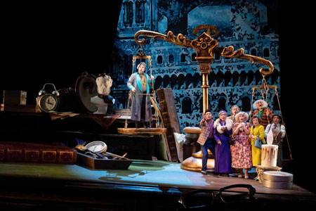 一方の《ジャンニ・スキッキ》は1918年初演。死んだ富豪の遺産を自分たちに有利に残そうと企む親戚たちが策士ジャンニ・スキッキに相談するが、逆に彼に全財産を騙し取られてしまうという喜劇。主役ジャンニ・スキッキには、こちらも世界のトップ・バリトン、カルロス・アルバレスが登場して、軽妙な役どころを鮮やかに(最後には日本語も駆使して!)楽しませた。演出(粟國淳)が面白い! 物語はすべて、巨大な書斎机の上で進む。1950~60年代風のポップな衣裳の登場人物たちは全員小人のようで、巨大なペンやインク瓶、ビスケットや天秤ばかりの間を動き回って、なんとも賑やか。子供が見ても楽しめそうだが、不倫殺人の物語とセットでは無理か? こっちも遺言状詐欺だし……。こちらは登場人物が総勢15人と多く、砂川涼子(ラウレッタ)、村上敏明(リヌッチョ)ら、アルバレス以外は日本人キャスト。超有名アリア〈私のお父さん〉から重唱の精緻なアンサンブルまで、屈託なく楽しんだ。
