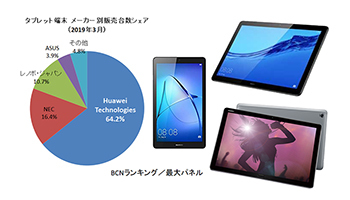 全国の家電量販店やECショップのPOSデータを集計する「BCNランキング」によると、Androidタブレットのメーカー別販売台数シェア(2019年3月)で、ファーウェイが64.2%を占め、1位を獲得した。同社は17年2月にトップに立って以来、26カ月連続でNo.1を維持している。