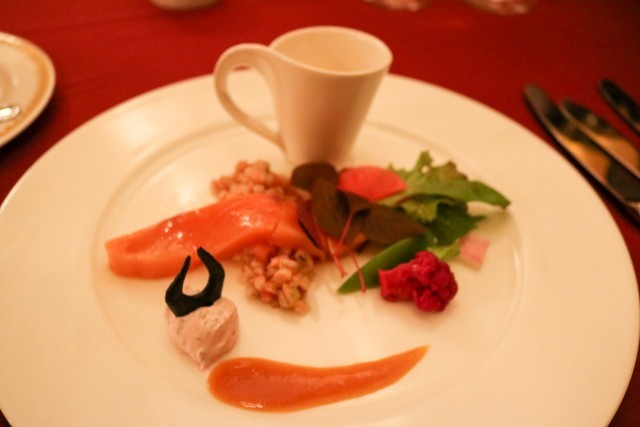 前菜はサーモンマリネとスペルト小麦のサラダ