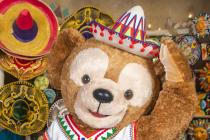 腕を乗せてコップの中をのぞきこんでいるダッフィー。
