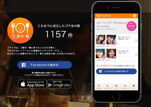 ご飯を一緒に食べたい人たちのためのマッチングサービスです。Facebookでの会員登録を行うと、毎日正午に3組の「ご飯食べたい」ペアが紹介されます。その際、自分の友だちは候補者に表示されないので、プライバシーを守れます。