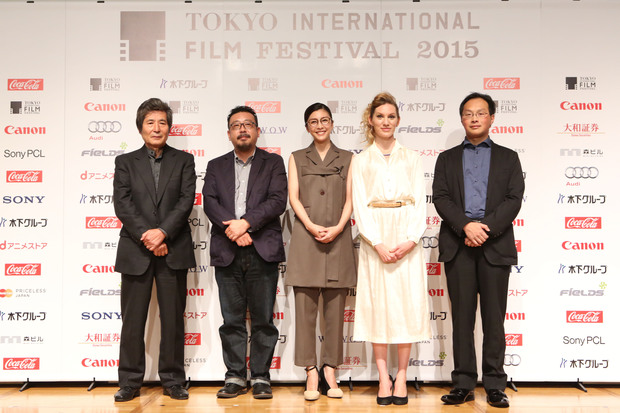 会見には邦画からコンペティション部門に選出された『残穢【ざんえ】-住んではいけない部屋-』から竹内結子、中村義洋監、『FOUJITA』から小栗康平監督、『さようなら』から主演女優のブライアリー・ロングと深田晃司監督が出席した。