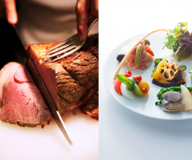 ホテルニューオータニが誇る各料理部門のスペシャリストによる逸品も登場。イチオシは、最高級「U.S.プライムビーフ」をじっくりと焼き上げた、ホテル伝統のローストビーフ。肉汁したたるジューシーな肉塊を目の前で切り分けてくれます。