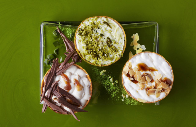 今シーズンのシェフイチオシスイーツは、3種の「茶葉ラテタルトのセレクション」。タルト生地に、ダマンド生地(焼いたアーモンドクリーム)を重ね、さらに抹茶・ほうじ茶・アールグレイのゼリー状ジャムを塗り、ミルクムースでふんわり食感を出しています。ラテ感覚で3種の茶葉の香りを楽しめる新作のタルトとなっています。