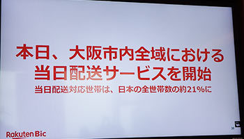 ビックカメラと楽天は4月17日、両社のショッピング会社「楽天ビック」が運営するECサイト「楽天ビック」が1周年を迎え、事業戦略発表会を開催、同日から大阪市内全域で当日配送サービスを開始したことを明らかにした。既に関東でスタートしている当日配送と合わせて、対応世帯は全世帯数の約21%をカバーする。