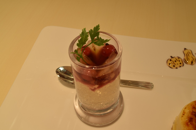 白ワインのゼリーにはベリーのコンポートや季節の果物がのっています。
