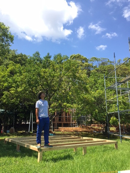 岐阜県美術館の庭に木製の“棲家”を作り、花を組み合わせたインスタレーション作品を制作。使用する木材や花は、すべて岐阜県産です。