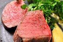 一頭一頭、体調を把握しながら個別に管理した黒毛和牛のランプ(お尻)は、赤身肉のおいしさが存分に味わえる部位として人気が高い。肉の風味は濃厚でありながらやわらかくてジューシー。塩かワサビで肉の味を楽しみたい。