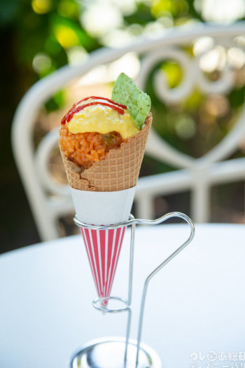 オレンジ色のチキンライスに緑のコーンチップスが刺さった人参カラーなので、園内で販売しているうさ耳キャップやカチューシャ姿で食べながらセルフィーするととっても可愛いですよ。