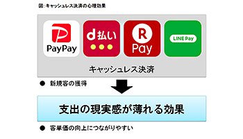 また、店舗側にとっても新規の顧客獲得につながり、キャッシュレス決済の方が客単価の向上も期待できる。実際に、マサチューセッツ工科大学が「クレジットカードで決済すると、支出の現実感が薄れるため支出機会が増加し、1回あたりの支出においても現金よりも多くのお金を使う可能性が非常に高くなる」という実験結果を出している。