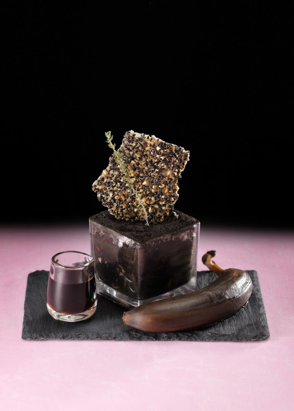 チョコと相性抜群な焼きバナナを添えた、甘すぎない大人な味のチョコレートパフェ。特製バルサミコソース付。