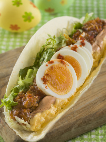 「フードブース」(シンデレラ城花壇付近)では、「BBQビーフ&エッグのソフトタコス」を販売しています。