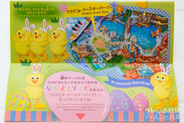東京ディズニーシーで配布している「うさピヨとなかよし」は、新キャラクター「うさピヨ」の紹介がメイン。