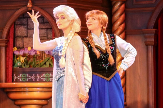 幼少期のストーリーが終わったところで、アナとエルサが登場!シアターの中も盛り上がります。