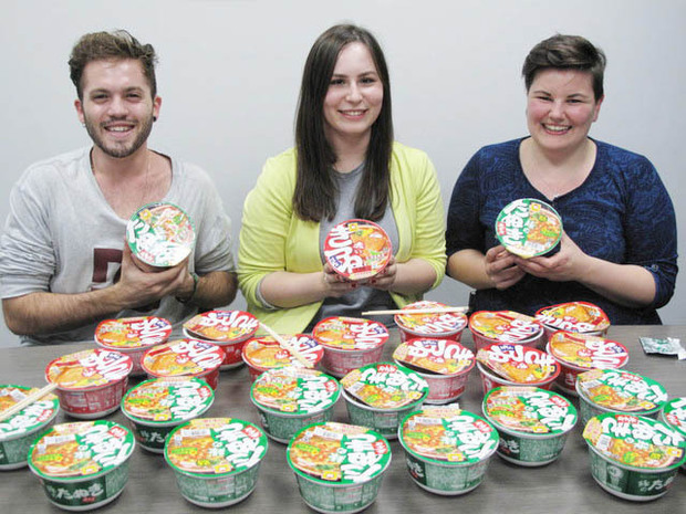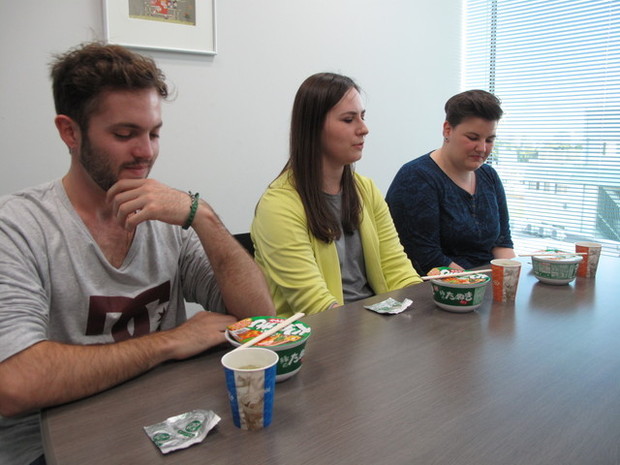 そこで、ウレぴあでは和食好きを公言する外国人留学生3名にお越しいただき、「赤いきつね」と「緑のたぬき」それぞれ4地域ごと――すなわち計8個を試食してもらい、味の違いや外国人の視点での好みについて忌憚のない意見を述べてもらいました。