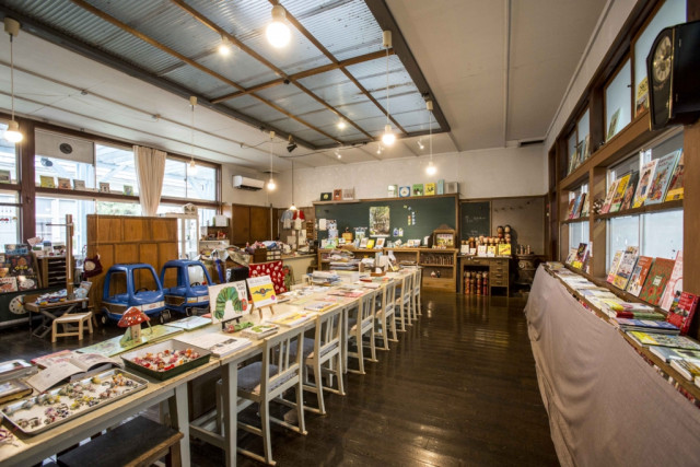 旧質美小学校の校舎を活用してお店が出店されています。特に絵本屋さんの「絵本ちゃん」は、常時約2000冊が販売。