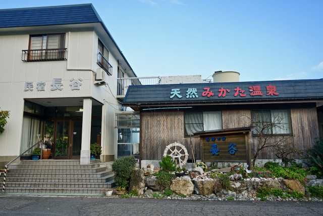 若狭町にある『民宿長谷』は、三方の天然温泉が楽しめる宿。テラス付きの部屋からは海をのぞみ、心地よい波の音が響きます。