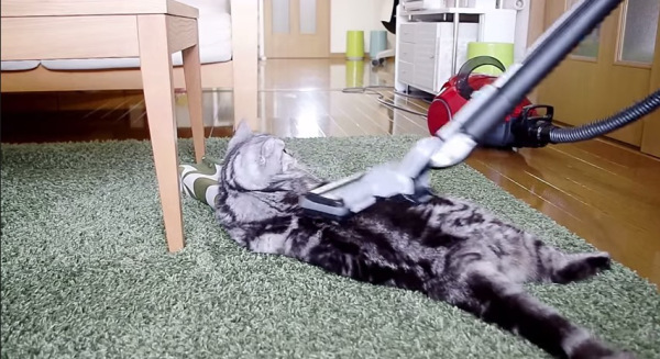 掃除機好きも掃除機嫌いも、多数観測されていますが、今日の動画は、好き度中の上と言ったところ。掃除機の音にはビクともせず、まるでカーペットと一体になったかのような、泰然とした態度で、日立製の掃除機に吸われています。