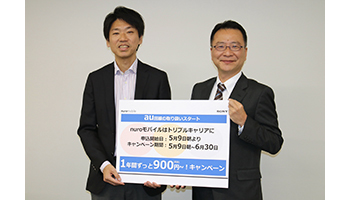 トリプルキャリア対応記念として、音声通話付きS・M・Lプランの月額料金を1年間割り引くキャンペーンを実施する。申し込み期間は、5月9日~6月30日。新規または他社からの乗り換えユーザーだけでなく、期間中の同一プラン継続利用者が対象になる。割引額は、Sプランが500円、Mプランが1000円、Lプランが1500円。