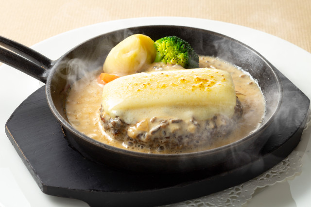 熱々の鉄板で焼き上げたビーフハンバーグに、チーズとバター香るなめらかなモルネソースをかけグラタン仕立てに。さらにコクのあるグリュイエールチーズをのせ焼き上げたチーズ好きな方へおすすめのボリュームたっぷりのひと皿です。