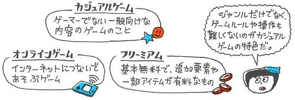 オンラインゲーム、フリーミアム、カジュアルゲーム…さまざまなジャンル名があるが、最近よく言われている「ソーシャルゲーム」は、概ね以下のような感じでいいだろう。