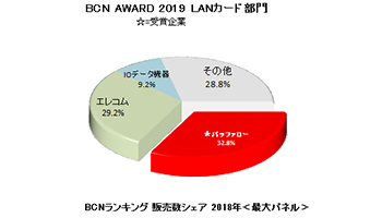 【BCN AWARD 2019・喜びの声】 全国の主要家電量販店・ネットショップのPOSデータを集計した「BCNランキング」のLANカード部門で、2018年1月~12月の1年間の販売台数シェアNo.1だったメーカーは、メルコホールディングスの中核企業のバッファローだった。同部門では20年連続トップの金字塔を打ち建てた。 同社は無線LANや外付けHDD、NASなど6部門でもシェア首位となり、グループ会社のシー・エフ・デー販売を含む11部門で受賞した。受賞の喜びを田中辰吾常務取締役に寄せてもらった。