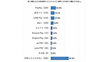 「利用したことのあるQRコード(バーコード)決済サービスをすべて選んでください。」という質問については、「PayPay」が18.2%で最も利用率が高い結果になったという。次いで、「楽天ペイ」が13.1%、僅差で「LINE Pay」が12.9%と続いたとのことだ。一方、64.3%という高い割合で「利用したことがない」と回答したという。