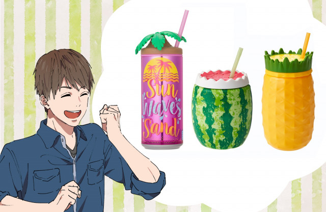 「トロピカルフルーツ タンブラー(スイカ、パイナップル)」は、見た目で夏を感じられるスイカとパオナップルのプラスチック2層構造のタンブラー。ストローにはストッパーのリングがついているので、ストローが抜けない工夫がされています。容量は470ml、価格は950円(税別)です。