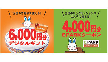 6月30日までのキャンペーン期間中に対象の電気・ガスの料金プランを同時に申し込んだ全員に、全国の吉野家で利用可能な6000円分の「吉野家デジタルギフト」と、EPARKリラク&エステと提携している店舗で利用できる4000円分の「EPARKクーポン」をダブルでプレゼントする。