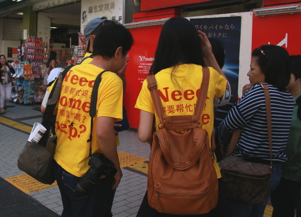 困っていそうな方がいたら、ガンガン話しかけていきます。お揃いの「おせっかいジャパン」Tシャツは黄色でとっても目立つので、向こうから話しかけてくる事も多いそうですよ。