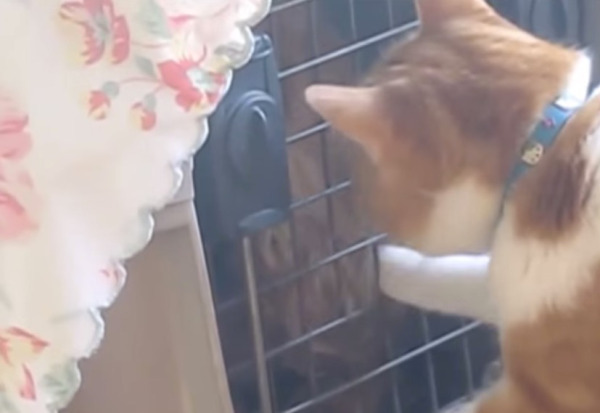 同居する犬が体調を崩したため、安静に過ごせるようキャリーケースに入ってもらっていたら…。そのワンコ大好きな同居の猫が、キャリーの扉を自力で開きお見舞い(?)するという動画です。