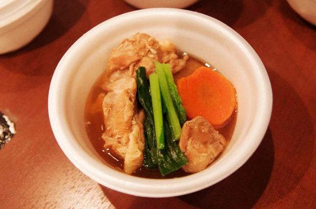 昆布・カツオ出汁のすまし仕立て。鶏肉とにんじん、ほうれん草など。でっかい椎茸もイン。イベニア取材班2人とも(秋田&茨城出身)「一番、馴染みのある味だね」と意見が一致。