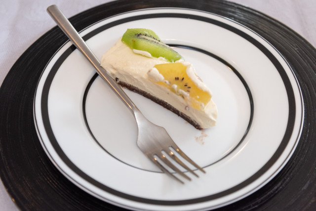 キウイフルーツをチーズケーキの上に載せるレシピ。キウイフルーツに合う味わいになるそう。