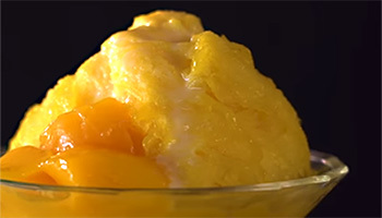 マンゴーピューレをふんだんに使った台湾風マンゴー氷1個分のつくり方は簡単だ。下ごしらえとして、マンゴーピューレ150gとオレンジジュース20ml、砂糖10gを小鍋に入れて、電子レンジや火にかけて砂糖が溶けるまで混ぜる。後は、粗熱がとれたら製氷カップに流し込んで冷凍庫で凍らせる。凍った氷をDTH-19に入れて削れば出来上がりだ。