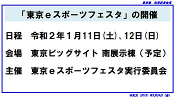東京都は2020年1月11日と12日に「東京eスポーツフェスタ」を開催すると発表した。会場は19年7月、東京ビッグサイトで新たにオープンする予定の南展示棟。東京eスポーツフェスタ実行委員会が主催する。