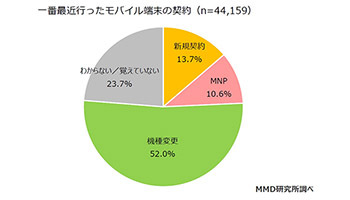 MMD研究所は、4月26日から5月7日までの期間で15~69歳の男女4万4159人を対象にモバイル通信契約に関する調査を実施した。調査によれば、直近のモバイル端末の新規契約や機種変更手続きについて最も多かったのは、「機種変更」で52.0%だったという。