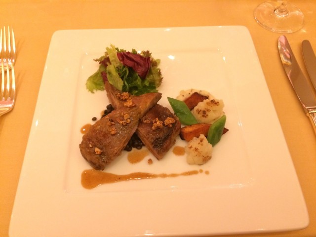 アーモンドのキャラメリゼがのったホロホロ鳥は身がぎっしりと詰まっています。