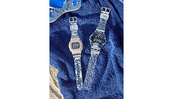 新製品は、環境団体のアイサーチ・ジャパン(国際イルカ・クジラ教育リサーチセンター)とのコラボレーション25周年を記念したモデル。海をイメージしたスケルトンカラーのバンドに、24頭のイルカ/クジラのイラストをプリントし、1頭のイルカ/クジラがバックライトに浮かび上がって、合わせて25頭が楽しく泳ぐデザインに仕上げた。